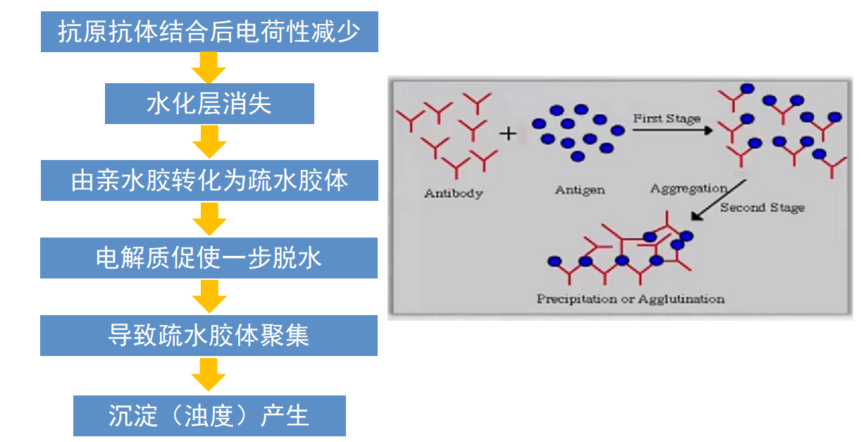 透射比浊:检测由抗原抗体结合成抗原抗体复合物,产生的浊度随抗原量增加而增加,其透光率强度随之减弱,根据吸光度值计算待测抗原的量。