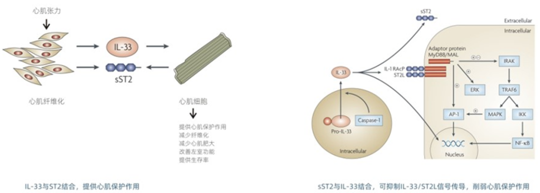 心脏标志物ST2,全称为生长刺激表达基因2蛋白,又称为肿瘤发生抑制蛋白2, 有两个亚型与心脏病的进程密切相关:可溶性形式(sST2)和跨膜受体形式(ST2L)。IL-33与ST2L结合,在心脏疾病或损伤时,引起对心脏功能的保护作用。在心脏应激状态下,可溶性ST2竞争性地和IL-33结合,减少IL-33和ST2L的结合,从而降低心脏保护,加快了疾病的进展。当心脏受到机械应急刺激的作用时,sST2水平明显升高,进而增加对心脏的损伤作用,在心脏病患者的诊断、治疗及风险预测中发挥着重要作用。